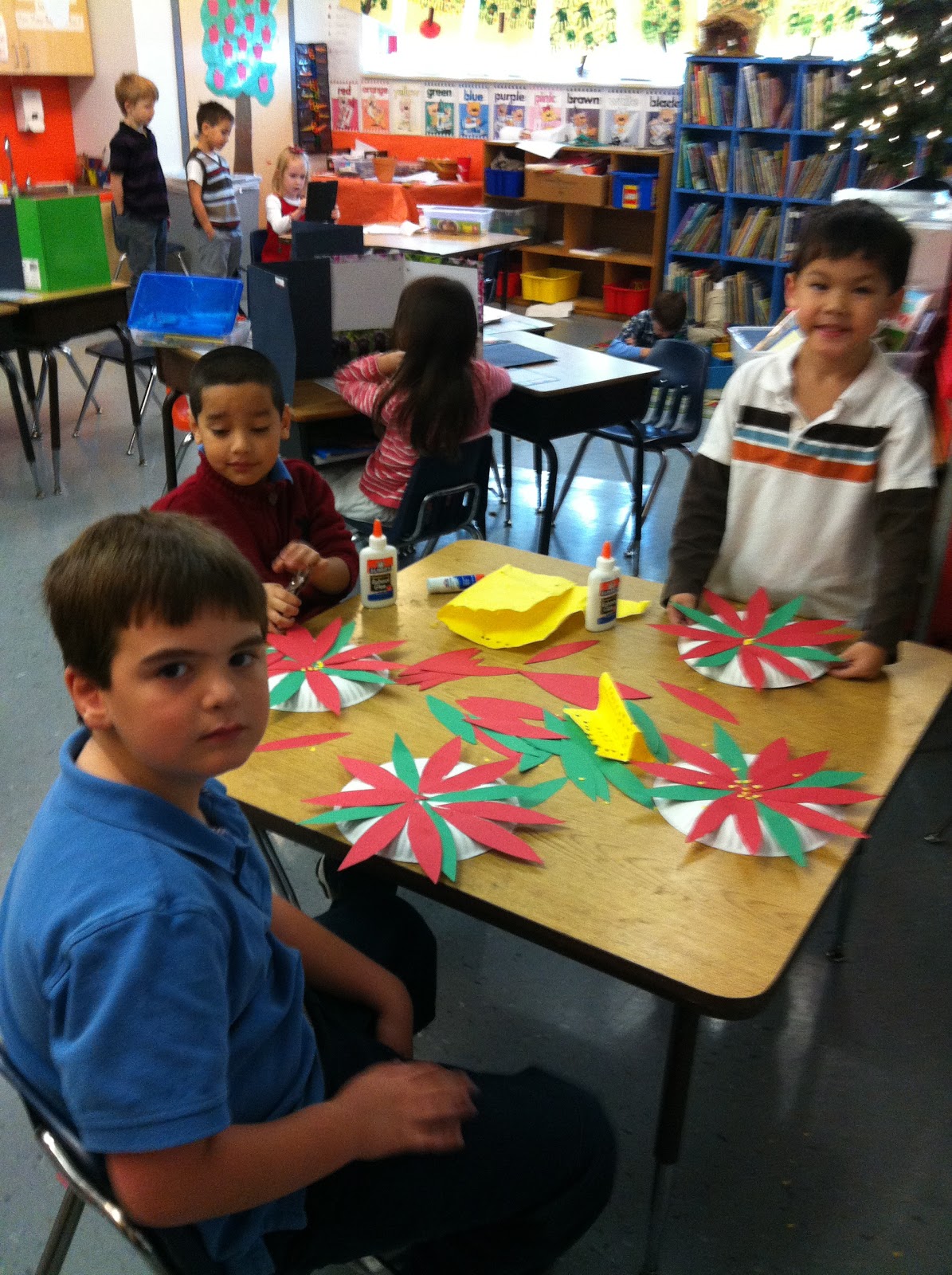 The children made their own holiday trees. They also made poinsettias as a decoration after reading The Legend of the Poinsettias by Tomie diPaola.